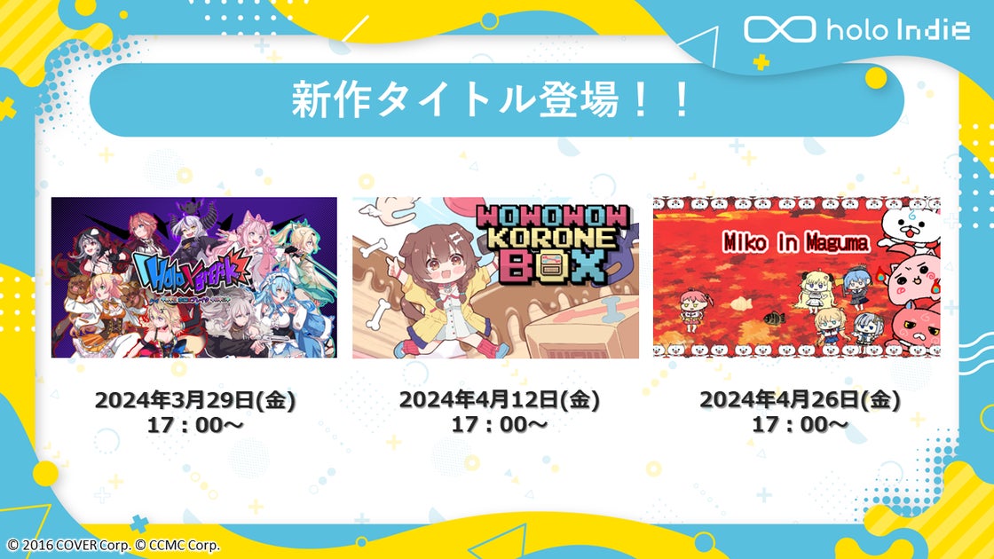 リリースされるタイトルには、『Holo X Break』(アクション)、『WOWOWOW KORONE BOX』(シューティング)、『Miko in Maguma』(2Dアクション)があります。