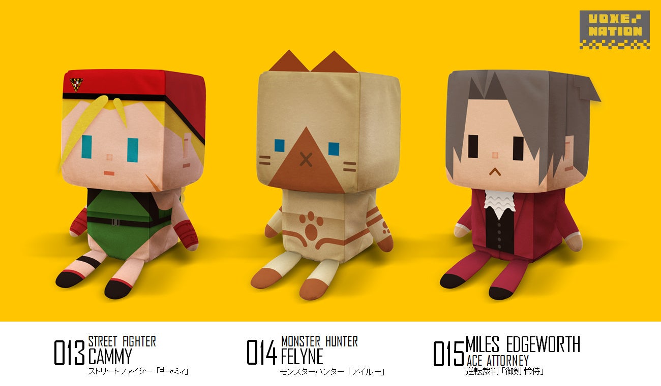 キューブ状の「ボクセル」タッチで表現された「キャミィ」や「アイルー」、「御剣 怜侍」などのぬいぐるみがラインナップされています。