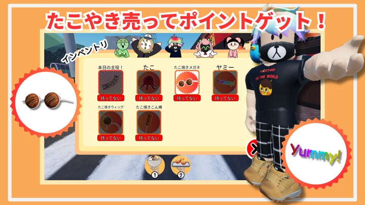 ゲーム内ではたこ焼き屋を経営し、独自通貨を獲得できるほか、オリジナルアイテムや限定アイテムも購入可能です。