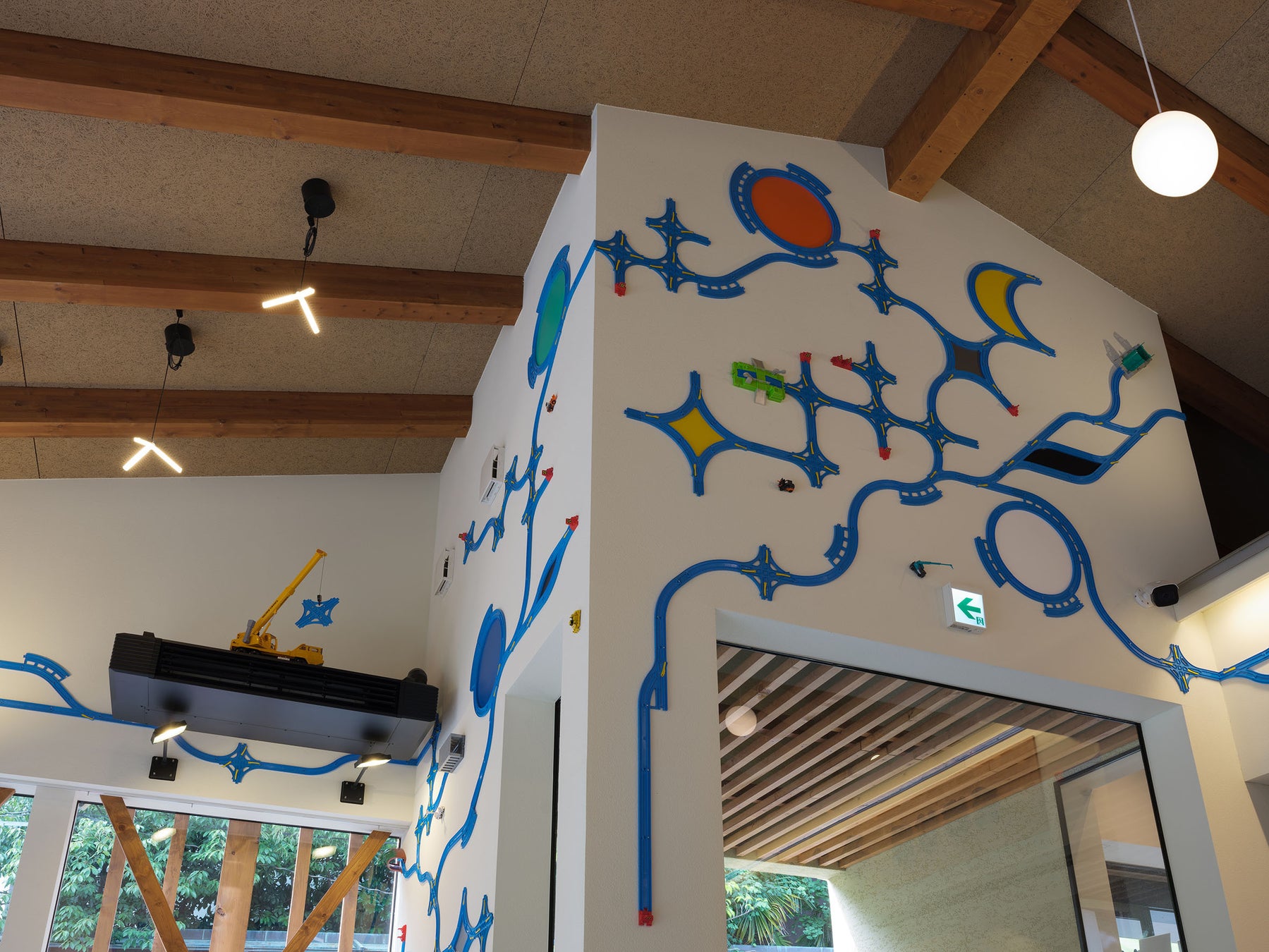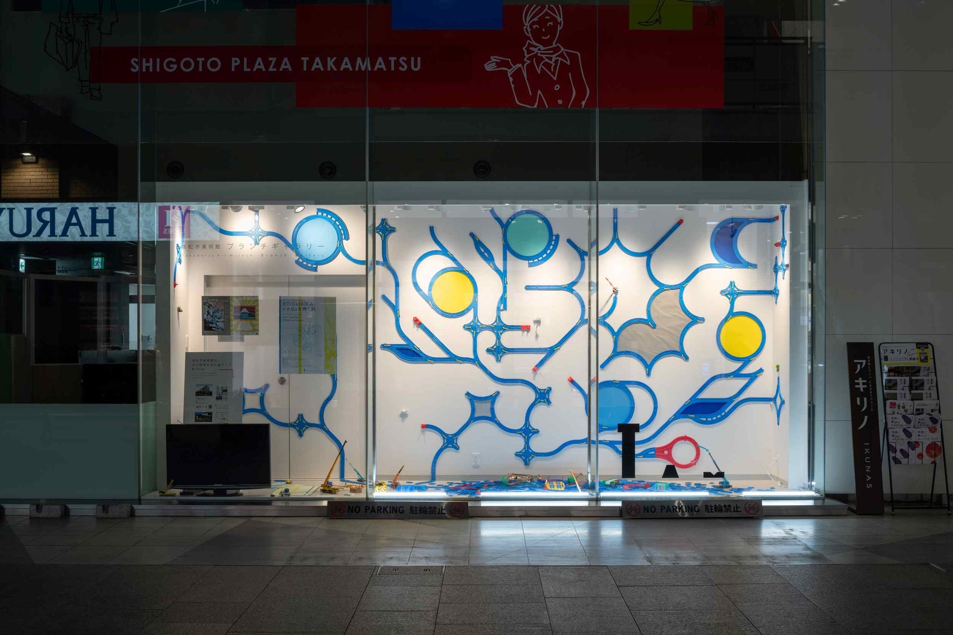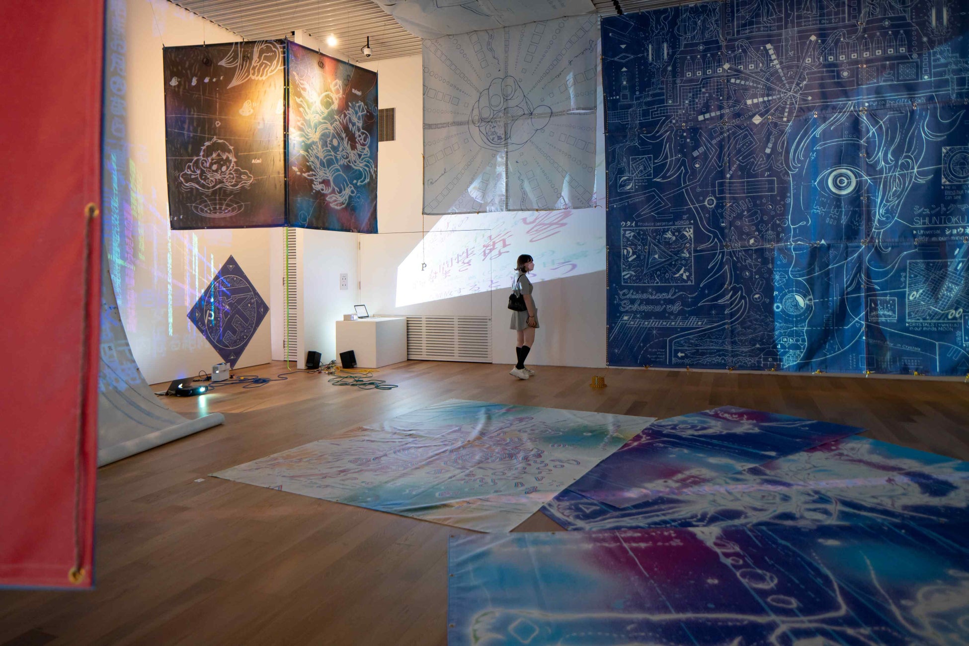中野は地元の伝説に興味を持ち、青いレールを使ったインスタレーションや巨大なドローイングで作品を制作しています。