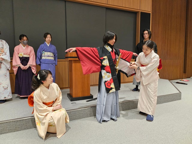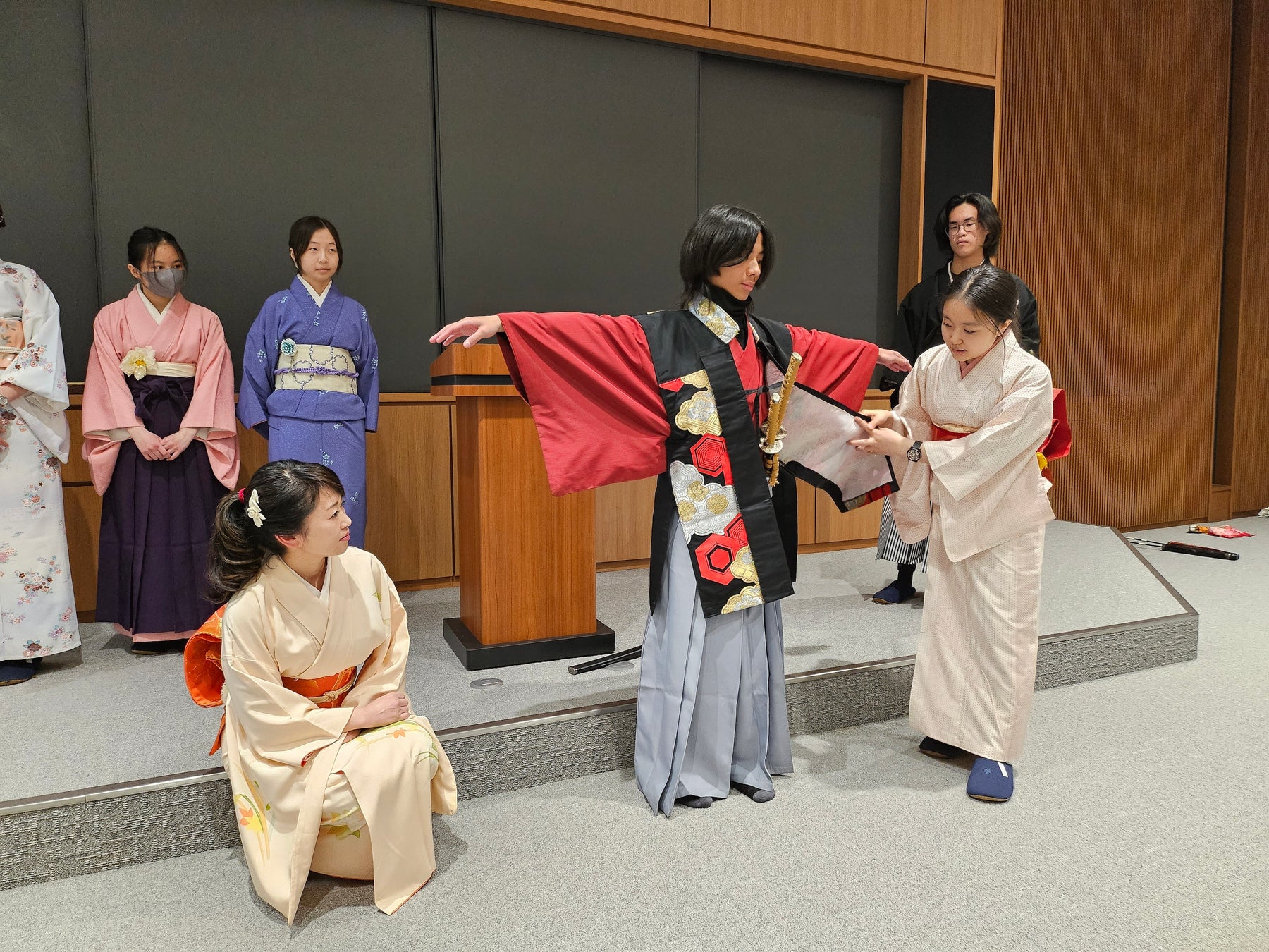 国際高校では、生徒が着付けや生け花を学び、ショーやワークショップで作品を制作しました。