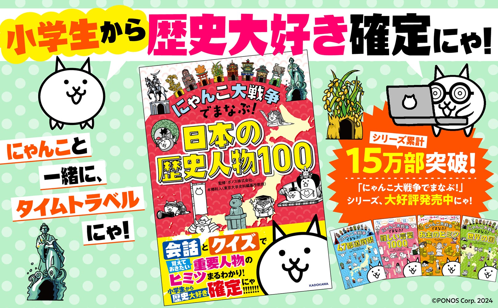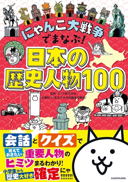 - 新刊『にゃんこ大戦争でまなぶ!』は、東大教授監修の学習書で、子ども向けに日本の歴史人物100人を楽しく学べる