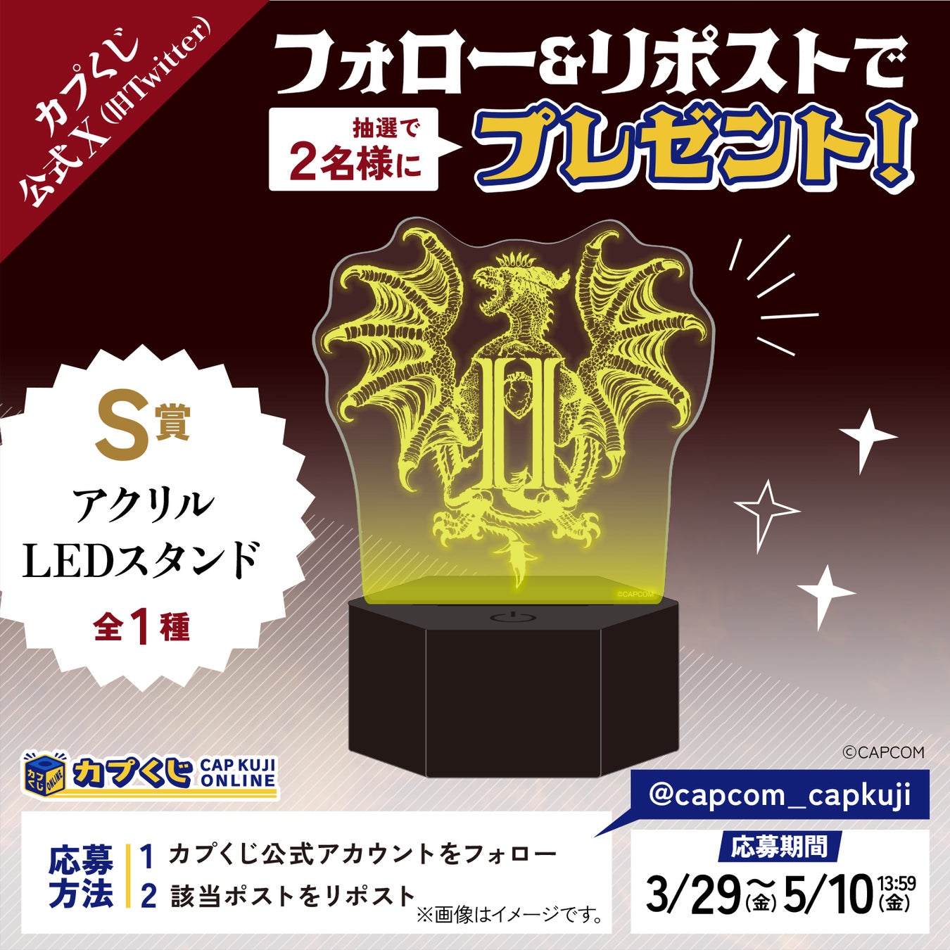 さらに、X(旧Twitter)フォロー&リポストキャンペーンも実施されており、@Capcom_capkujiをフォローしポストをリポストすると抽選で「S賞:アクリルLEDスタンド」がプレゼントされます。