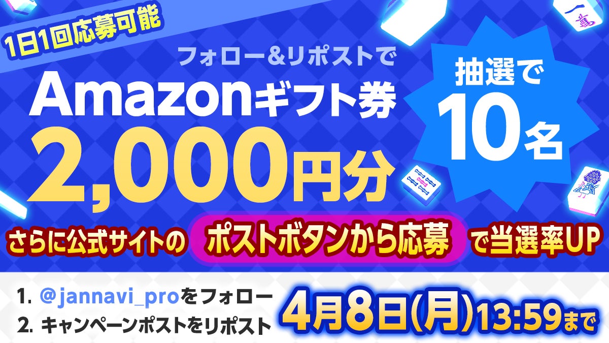 ジャンナビ麻雀オンライン公式Twitterアカウントをフォローし、指定のポストをリツイートすると、Amazonギフト券2000円分が当たるキャンペーンが開催中です。