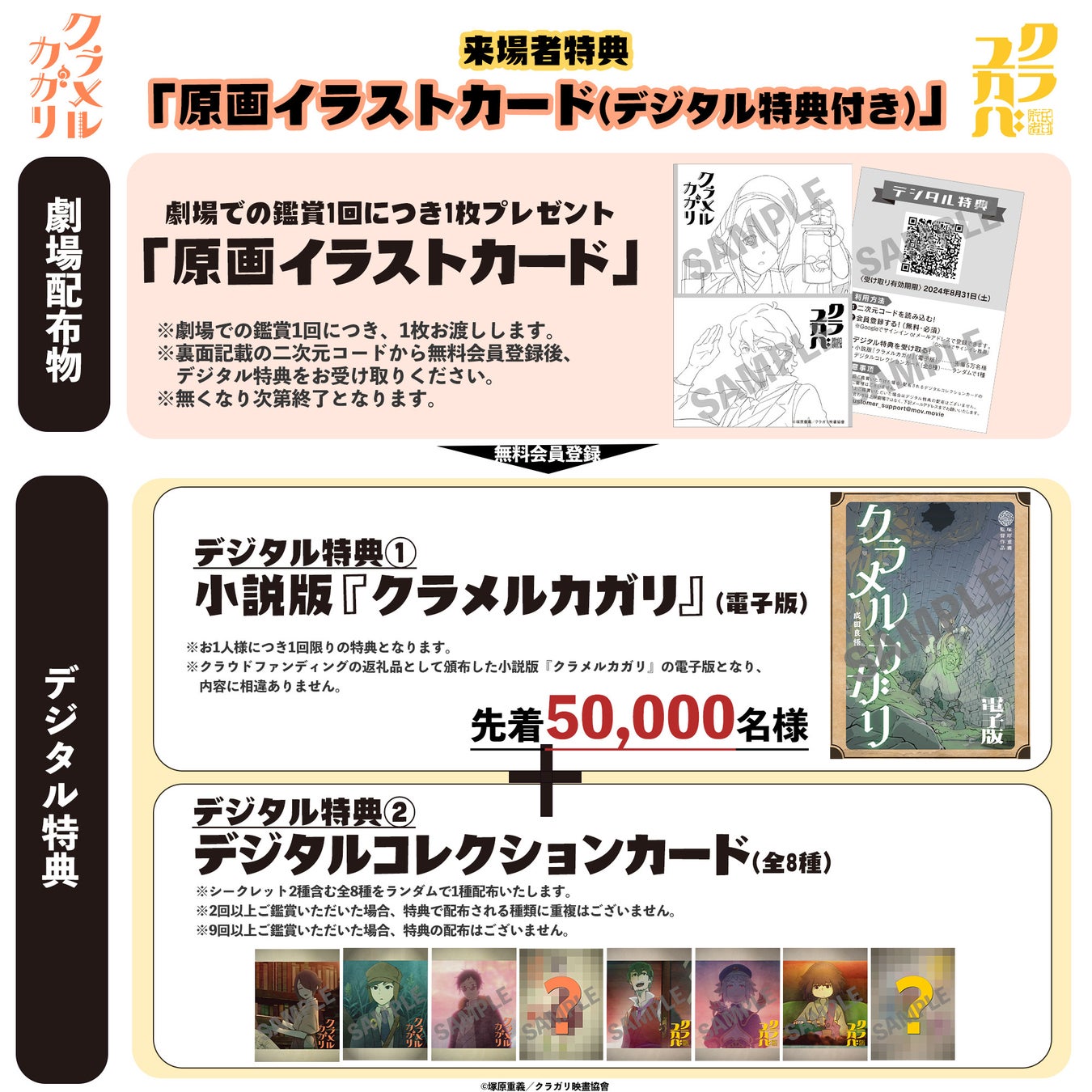 また、『クラメルカガリ』『クラユカバ』の来場者特典として、原画イラストカードとデジタル特典が配布されることが発表されました。