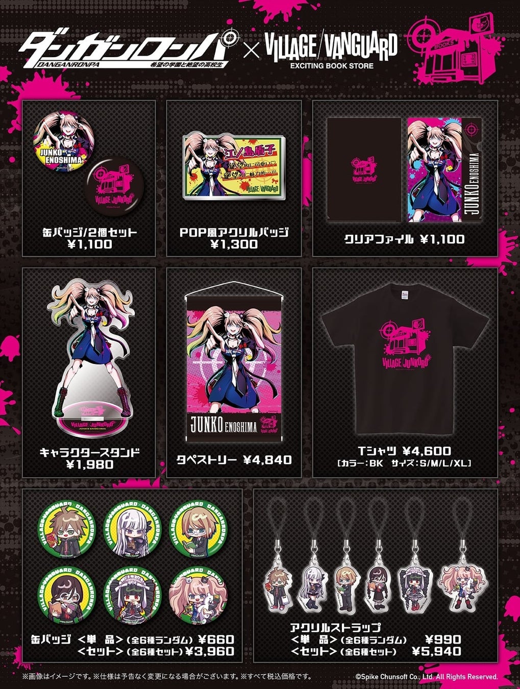 スパイク・チュンソフトの『ダンガンロンパ』とVillage Vanguardのコラボグッズ「VILLAGE/JUNKORD」が登場!江ノ島盾子のイメージを描いたグッズやキュートなミニキャライラストグッズが販売中です。