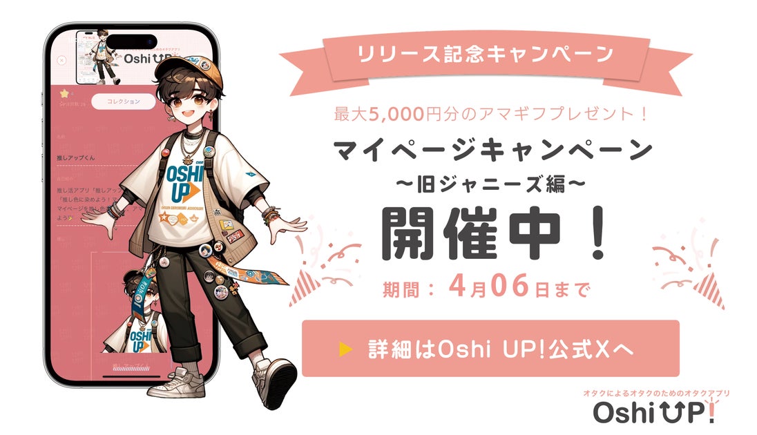 「Oshi UP!(推しアップ)」リリースキャンペーン第二弾が開催決定!参加者は推しジャニでマイページをカスタマイズし、ハッシュタグ「#推しUP」をつけてX(旧Twitter)に投稿すると、最大5000円のアマゾンギフト券がもらえます。