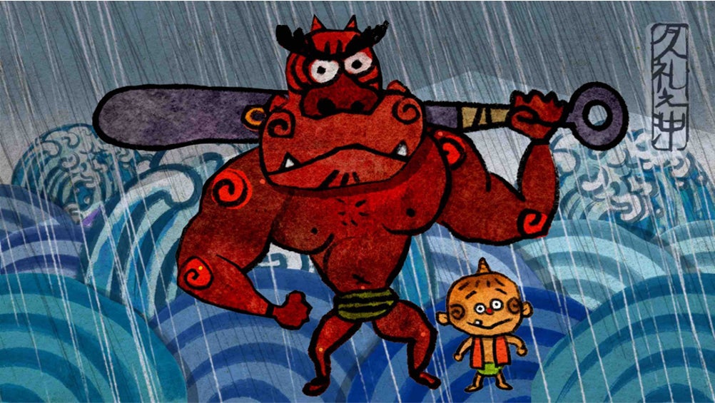荒波に立ち向かう鬼の親子が島を湾内に作り、町民を守るストーリーが展開されます。