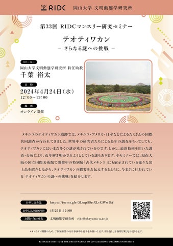 RIDCは定期的に「RIDCマンスリー研究セミナー」を開催しており、今回はオンラインでテオティワカン遺跡に関するセミナーを行います。