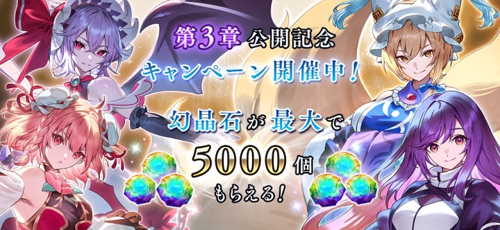 3月31日(日)から始まるメインストーリー第1部第3章「絶望の先に在るもの」の公開を記念して、最大5,000個の幻晶石が手に入るキャンペーンが開催中です。