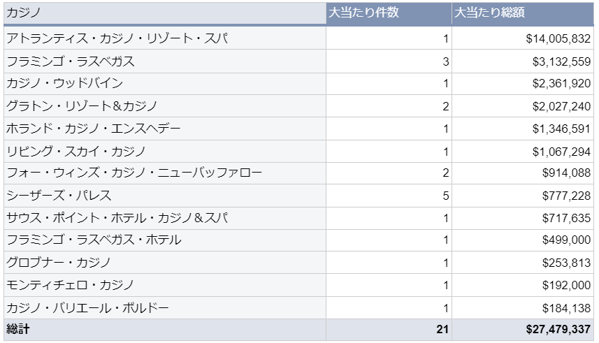 最高額はアトランティス・カジノ・リゾート・スパの14,005,832ドルで、大当たりした件数は合計21件でした。