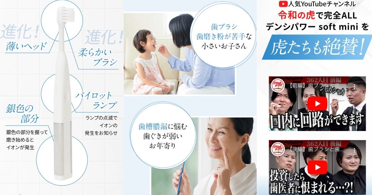 ソフトミニは毛先をソフトにすることで、小さなお子様や歯茎の弱い方にもおすすめ。加えてイオン歯ブラシは水だけでも効率よく歯垢を落とすことができるため、歯磨き粉が苦手な方の歯垢除去にも最適です。また、弊社代表が大人気ビジネス系YOUTUBE番組【令和の虎】にも出演し、ブランドヒストリーや商品の品質を虎たちが大絶賛しております。