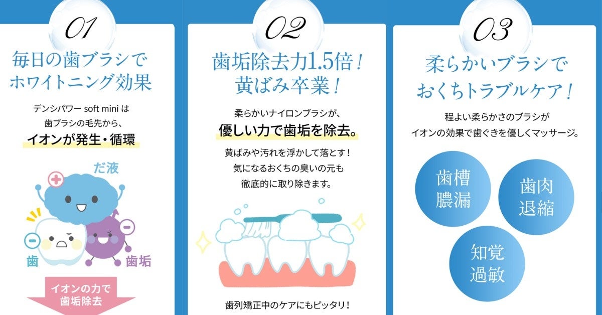 この商品は、35年の歴史を持つ電子イオン歯ブラシ【デンシパワー】の集大成で、毛先をよりソフトにし、特に奥歯までしっかり磨けるように設計された。
