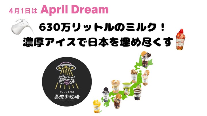 夜のアイス専門店「真夜中牧場」が4月1日のApril Dreamに賛同し、630万リットルのミルクを使用して日本中に濃厚なアイスを提供する夢を発表しました。