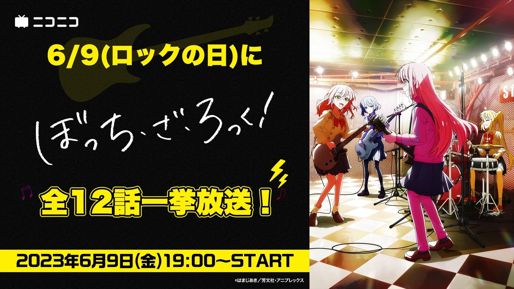アニメ『ぼっち・ざ・ろっく!』は、2022年10月期に放送され、ニコニコのアニメ総合サイト「Nアニメ」の2022年秋アニメランキングの上位にランクイン。2024年春には劇場総集編の上映も決定するなど、話題になっている作品です。この度、同作品を、6月9日(金)の“ロックの日”にちなみ、全12話の一挙放送を実施します。