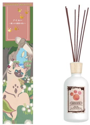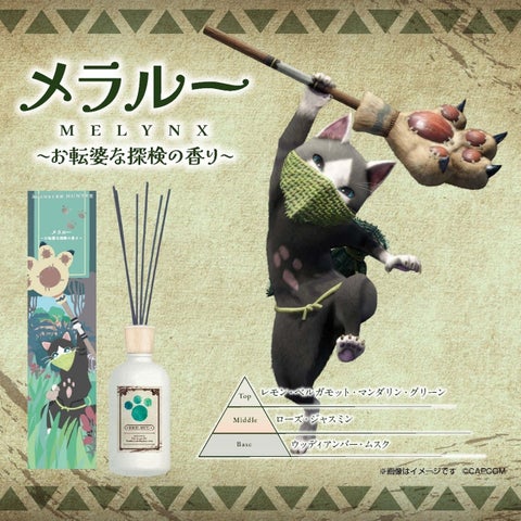 「モンスターハンター」の世界を香りで表現したリードディフューザーが登場しました!ジンオウガ、タマミツネ、アイルー、メラルー、回復薬の5種類があり、それぞれの特徴や世界観を表現しています。