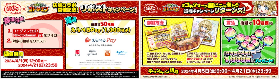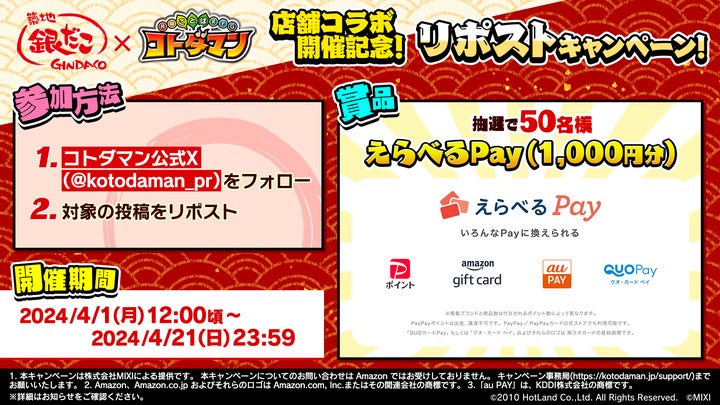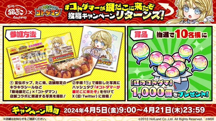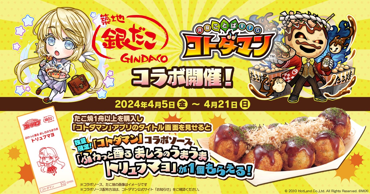 - 2024年4月5日から21日まで「築地銀だこ」と「コトダマン」のコラボ開催