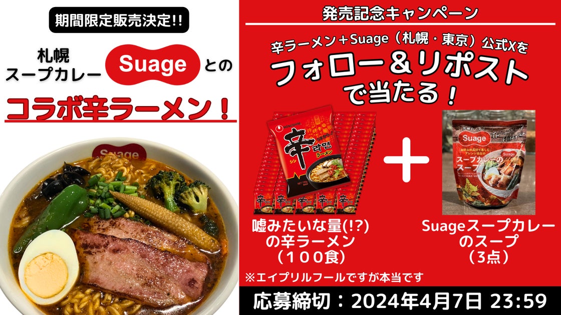2024年4月1日から、北海道スープカレーの「Suage」と「辛ラーメン」がコラボした「シン・すあげラーメン」がSuage全店舗で期間限定販売されます。