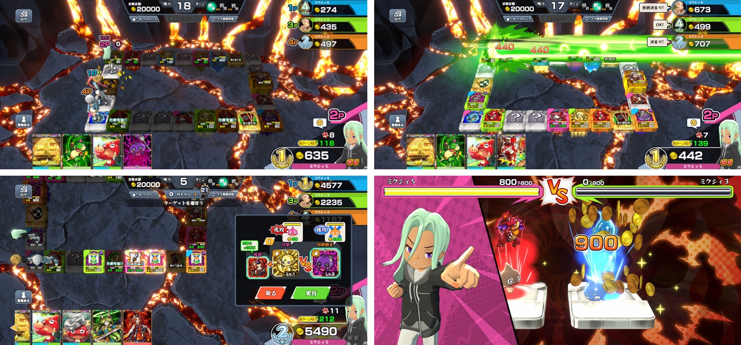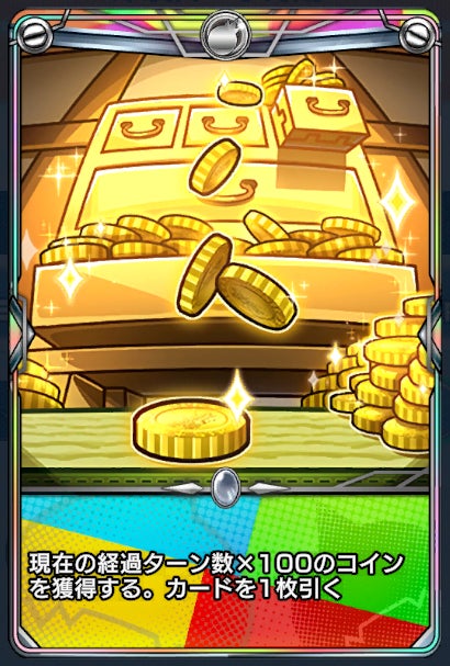 他プレイヤーとコインを奪い合います。戦い方は十人十色、ひたすら自身のマスを強化し収益性を高める、または積極的にカードで他プレイヤーを攻撃するなどさまざまな勝ちパターンがあり、「デッキ編成の戦略性」「プレイ中の判断」「他プレイヤーたちとの駆け引き」の3つの要素が融合した戦いが繰り広げられます。