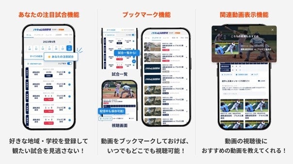 自分の好きな地域や高校を登録出来る「あなたの注目試合機能」や、観たい動画を後からでも視聴出来る「ブックマーク機能」、試合終わりにおすすめの動画を教えてくれる「関連動画表示機能」を新搭載しました。自分好みにカスタマイズすることで、多くの試合が同時配信されるなかでも、球児たちの勇姿を見逃さず、いつでもどこでも高校野球の魅力を堪能することが出来ます。