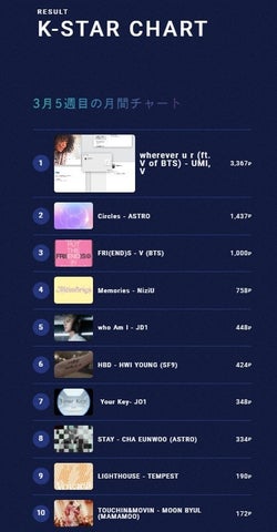 3月の「K-STAR CHART presents POP-K TOP10 Friday」では、UMIとV(BTS)のコラボ曲が3カ月連続で1位を獲得し、MVPに選ばれました。