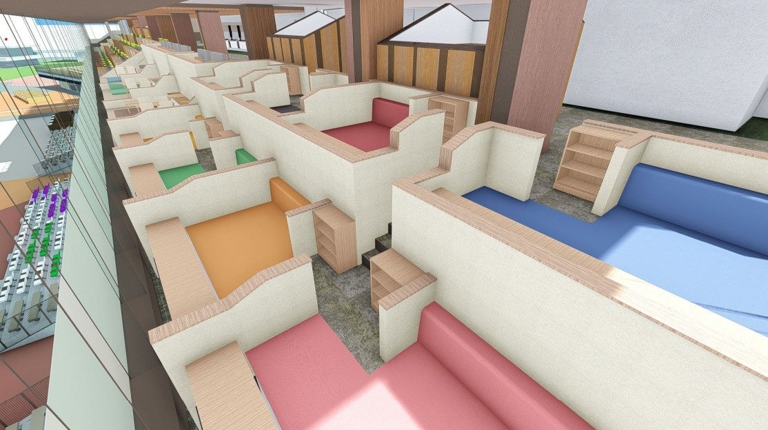 ユニバーサルデザインに配慮し、特別観覧席や飲食店、ベビールームなどが設けられます。