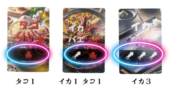 - 短時間で楽しめるテーブルゲームで、イカとタコを予想して点数を賭け合う