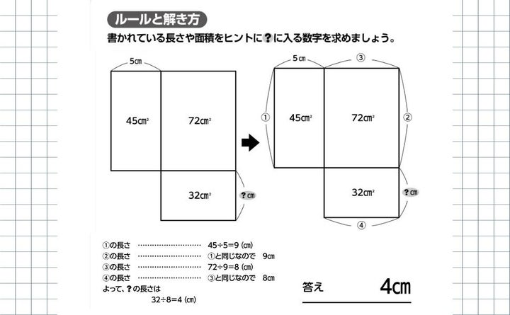 タテ×ヨコ=面積の知識だけで解ける難問で、大人も手こずるほどの難しさです。