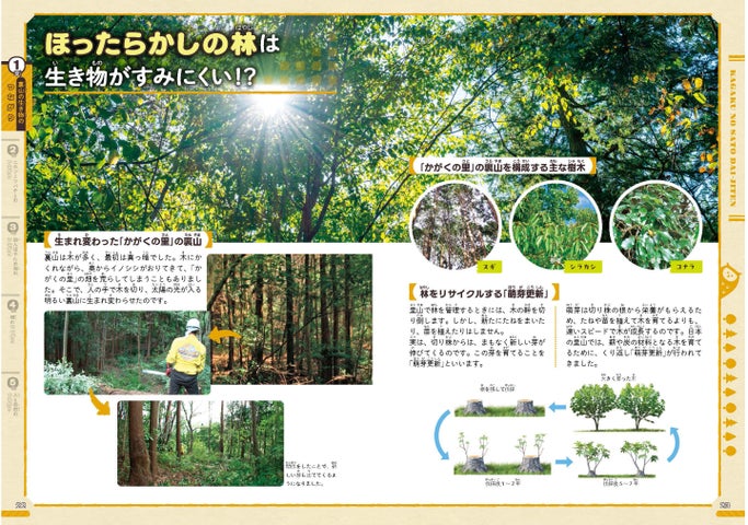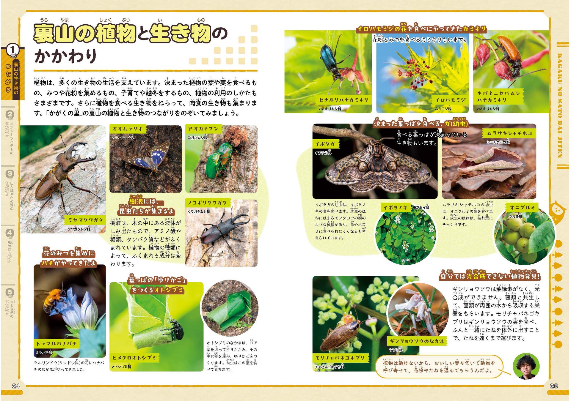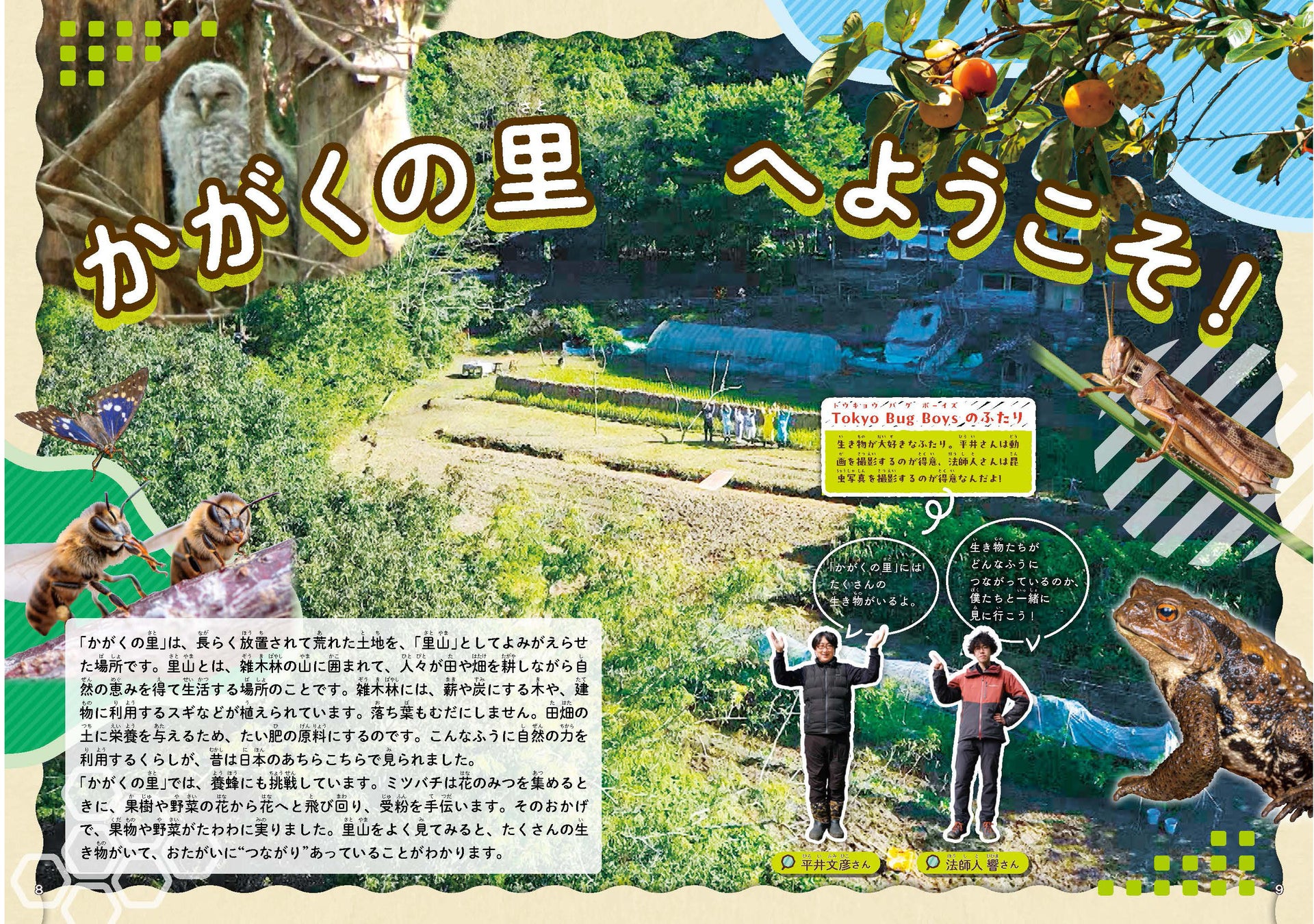 本書では、かがくの里での生き物と人との関わりを写真と先生の解説で紹介しています。