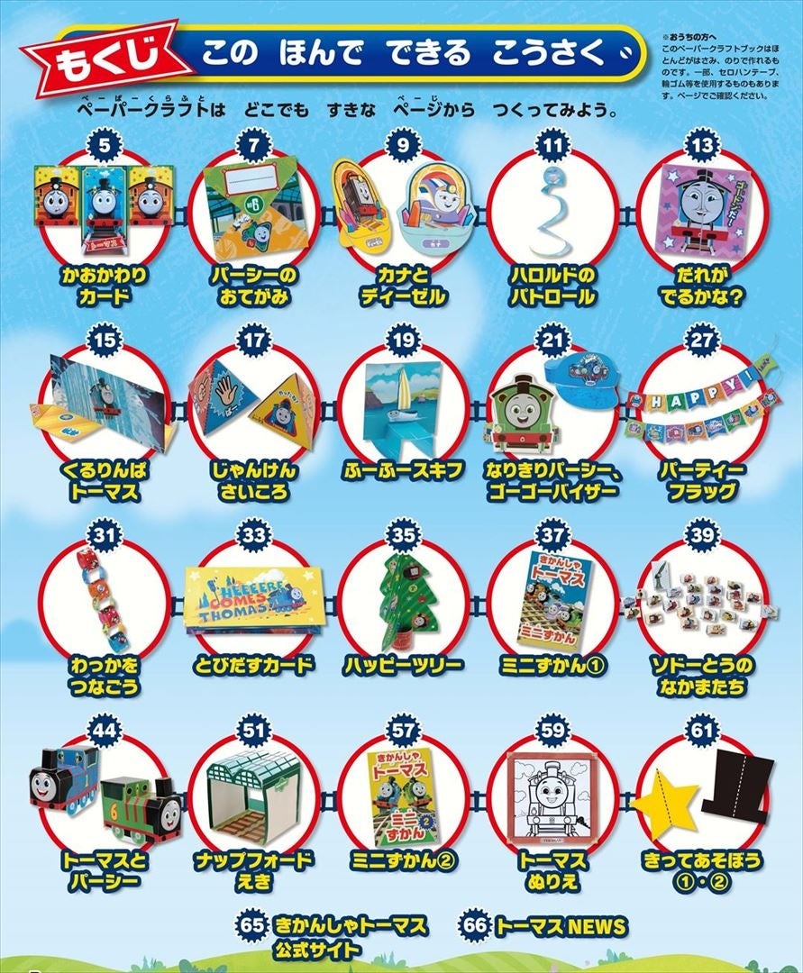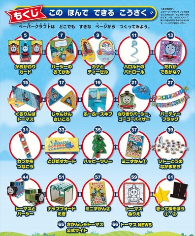ページを切って折り、のりを貼るだけで完成する工作が楽しめ、トーマスのキャラクターがたくさん登場します。