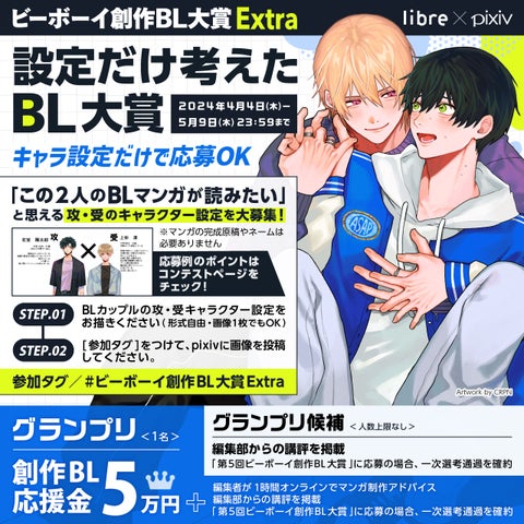 株式会社リブレと大手投稿サイト「pixiv」が共同で、創作BLコンテスト「ビーボーイ創作BL大賞Extra 設定だけ考えたBL大賞」の応募を開始します。
