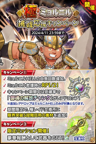 - 極・ミョルニル挑戦応援キャンペーン、特攻ガチャ、期間限定パック、イベントクエスト、PC/スマホ、公式アカウント