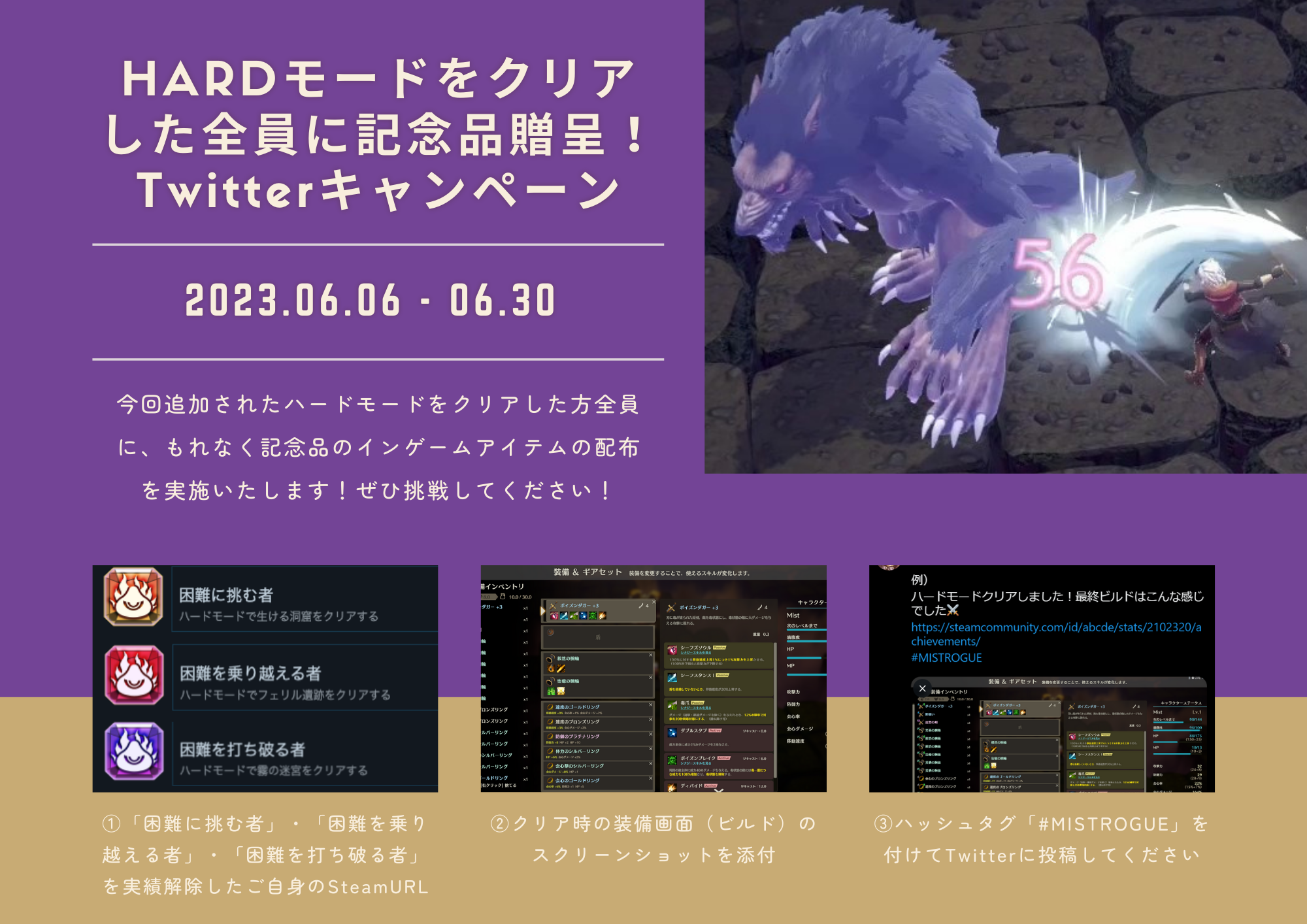 今回追加されたハードモードをクリアした方全員に、もれなく記念品のインゲームアイテムを配布するTwitterキャンペーンを開催いたします(※記念品はSSR装備等ではなく、ゲームの難易度に影響を及ぼさないトロフィー等を予定しております)。以下の参加方法をご一読いただき是非チャレンジして下さい。またクリア時のビルドや攻略方法などの情報も、プレイヤー間でぜひ共有してください。皆様の挑戦をお待ちしております!