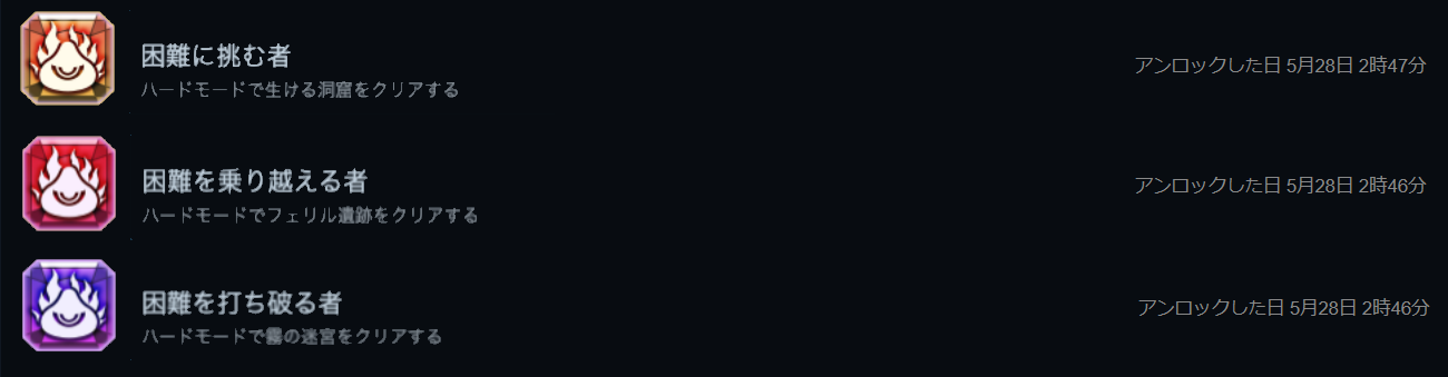 ① ハードモードをクリアしたことがわかる、ご自身のSteam実績のURLを記載してください(「困難に挑む者」・「困難を乗り越える者」・「困難を打ち破る者」の3つの実績解除がハードモードクリアに相当します)