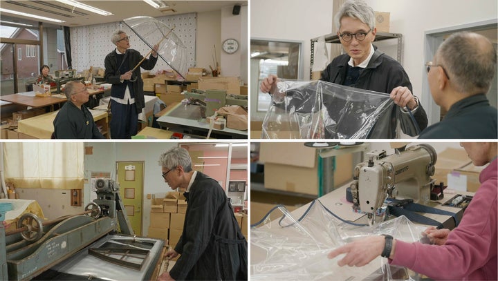 老舗傘工房「ホワイトローズ」を訪問し、宮内庁で使用される傘の製造ストーリーや技術開発を紹介しています。