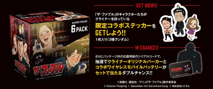 クライナー × ザ・ファブルコラボボックスは数量限定で、6種のフレーバーが楽しめるアソートパックで、SDキャラクターのステッカーも封入されています。