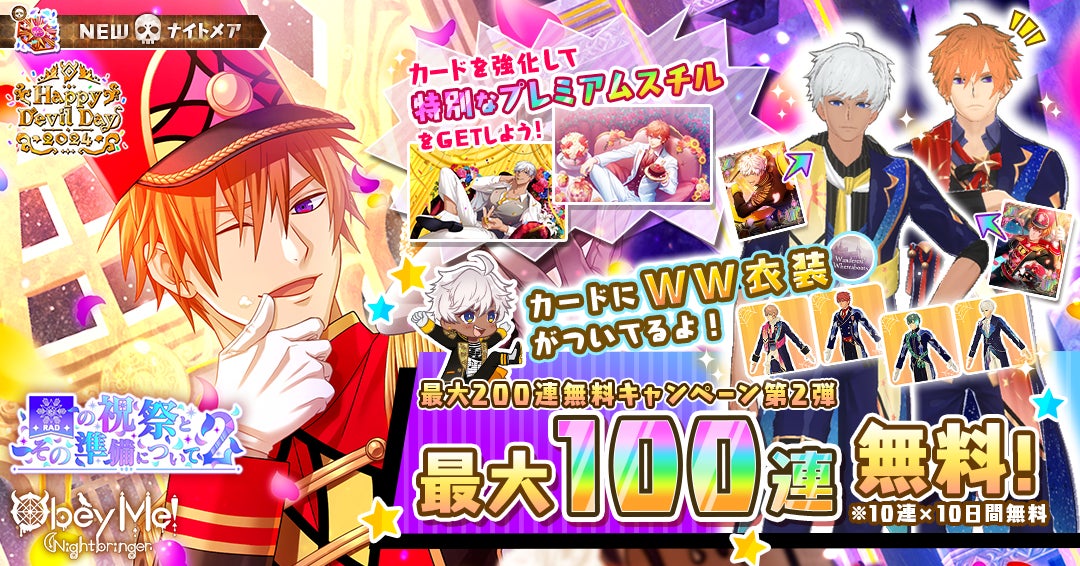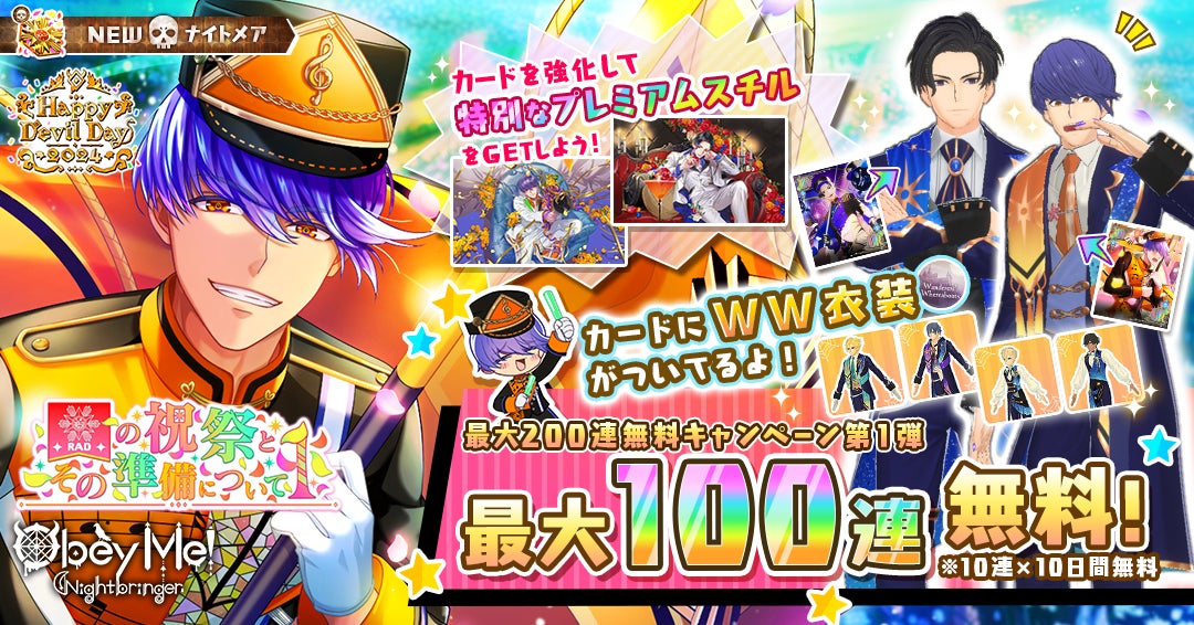 ナイトメア「RADの祝祭とその準備」では、最大200連無料ガチャがあり、UR+カードには3D衣装とプレミアムスチルが付いています。