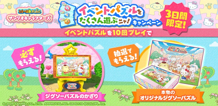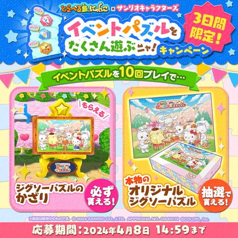 イベントパズルを10回遊ぶと特別なかざりがもらえ、さらに抽選でオリジナルジグソーパズルが当たります。
