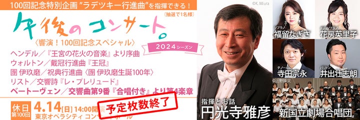 2024年4月14日には「第100回休日の午後のコンサート」が開催され、マエストロ円光寺雅彦が指揮とお話を担当し、俳優の石丸幹二さんが特別ゲストとして登場します。