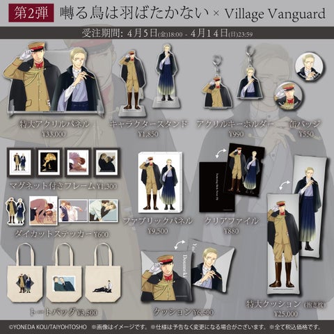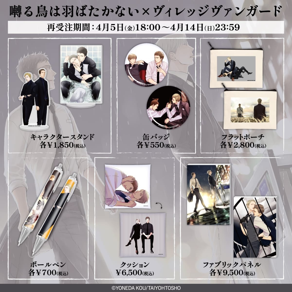 - 2024年4月5日より、大洋図書の人気BL作品【囀る鳥は羽ばたかない】とヴィレッジヴァンガードの限定コラボグッズ第2弾が発売決定