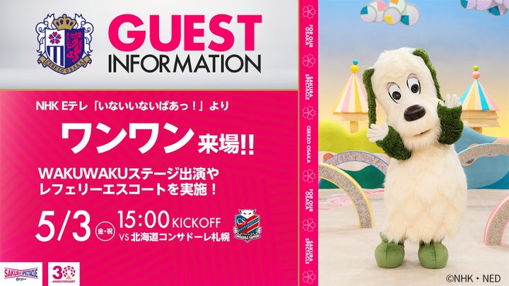 NHK Eテレで放送中の「いないいないばあっ!」の人気キャラクター、ワンワンが5/3(金・祝)に北海道コンサドーレ札幌戦に来場します。