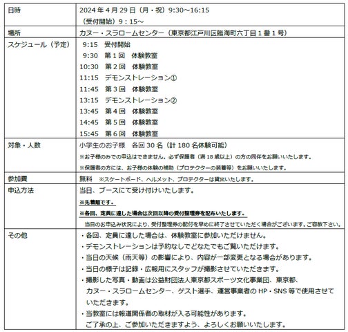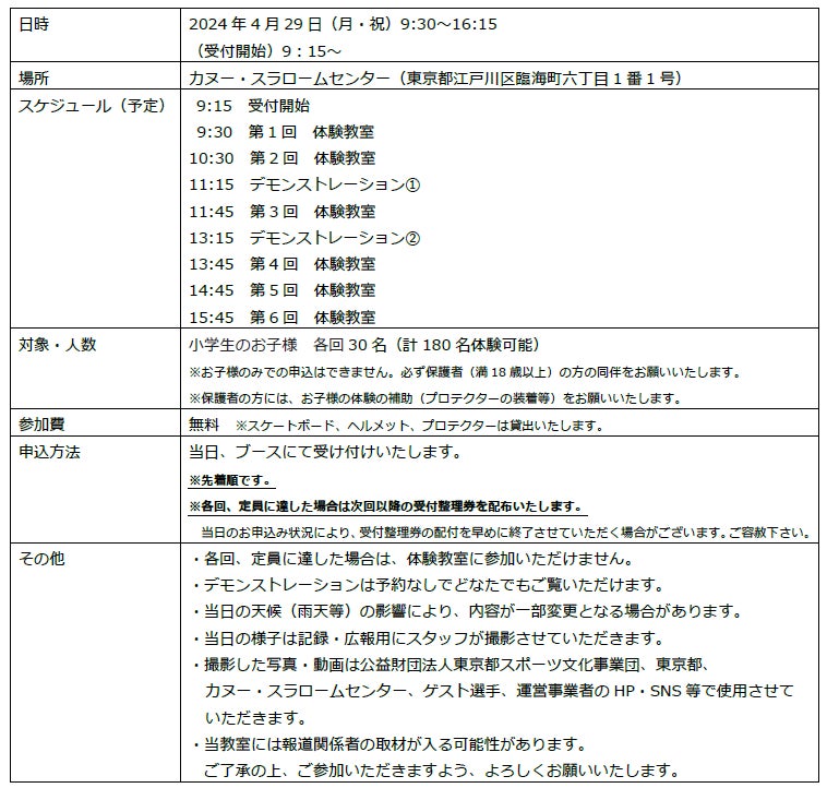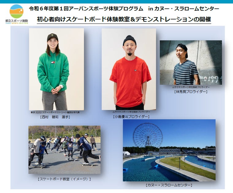 第1回は4月29日にスケートボード体験教室を開催し、世界トップスケーターでX Games優勝経験を持つ西村碧莉選手のデモンストレーションも予定されています。
