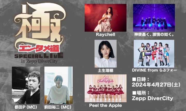 Zepp Diver City(Tokyo)で豪華アーティストのトーク&ライブが開催され、出演アーティストには土生瑞穂やRaychell、DIVINE from らぶフォーなどが含まれます。
