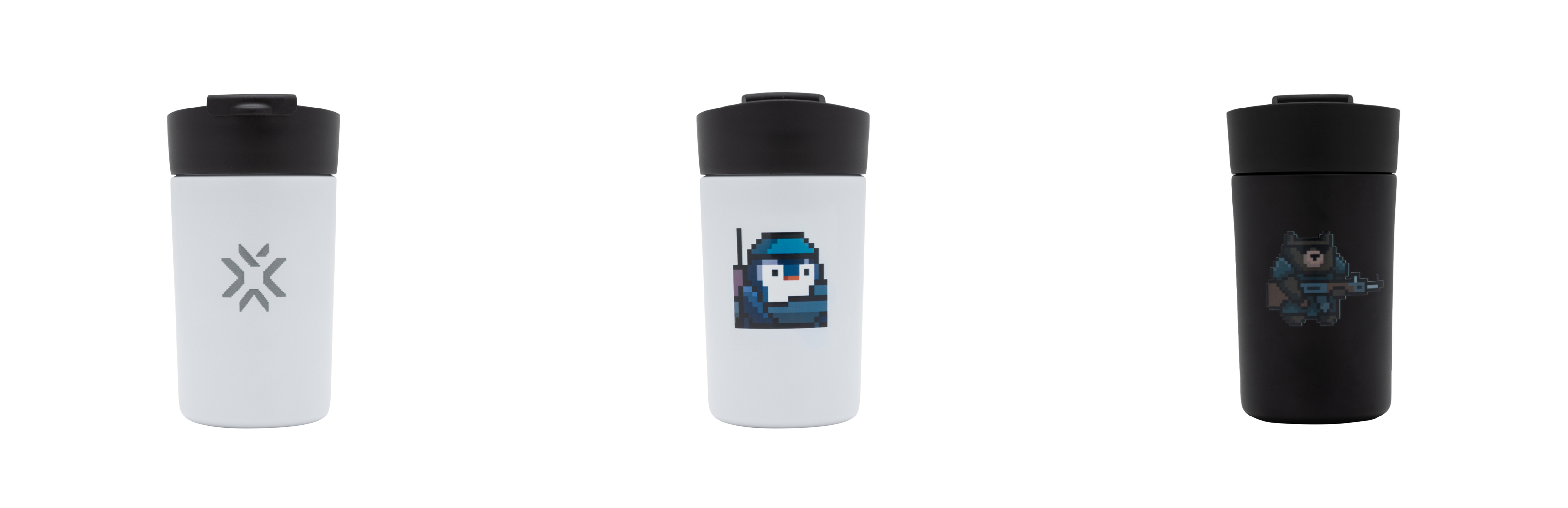 ステンレス製のサーモタンブラー。ステッカーと同じく8BITのキャラクターをプリントしキャッチーな仕上がりに。プリントを活かすため、ベースカラーはシンプルにモノトーンにしました。プレイ中のご自宅でもオフィスでもテーブルの上でMASTERSを感じることができます。