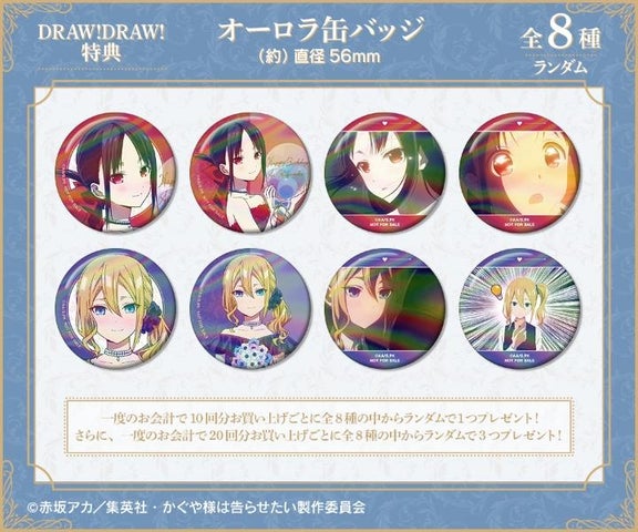 また、10回ごとに特典としてオーロラ缶バッジがプレゼントされ、購入サイトによって異なる絵柄が用意されています。