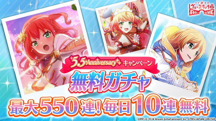 - アニバーサリーキャンペーン、550連分の無料ガチャ、イベント課題、無料ガチャ、毎日10連無料ガチャ、5,500万スタァジェム山分けキャンペーン、公式サイト