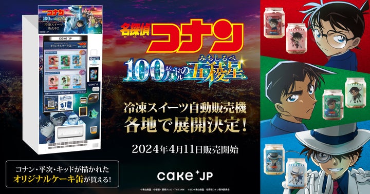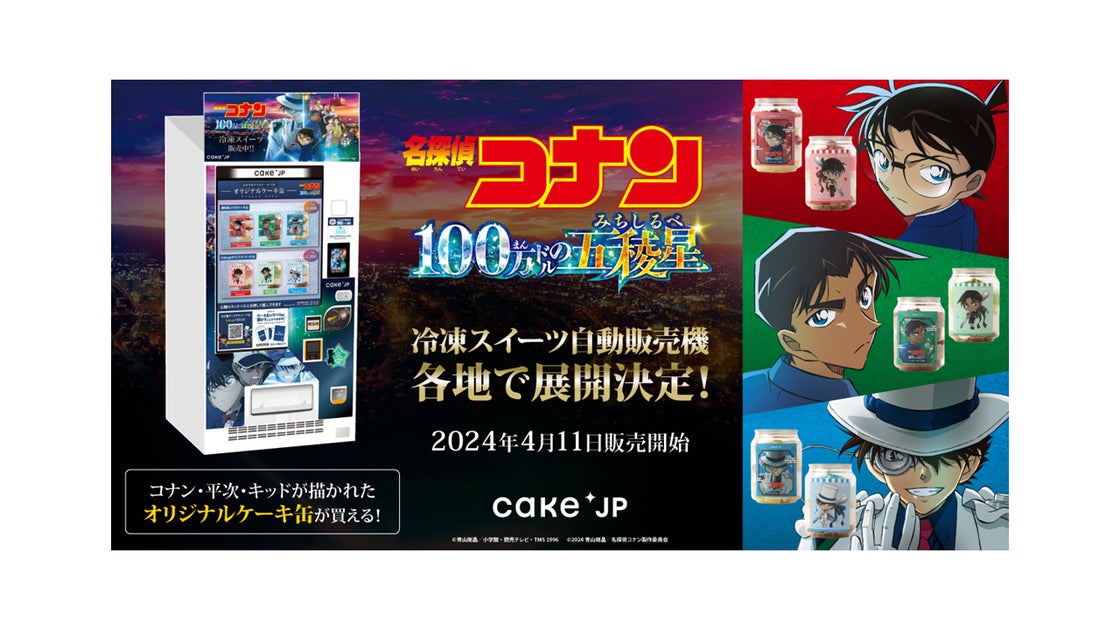 2024年4月11日から、株式会社丸井が「Cake.jp」と劇場版「名探偵コナン 100万ドルの五稜星」とのコラボで、オリジナルケーキ缶を販売する自動販売機を14店舗に設置します。