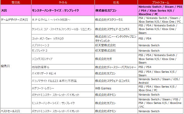 - 年間作品部門で日本国内の優れたゲームタイトルが表彰