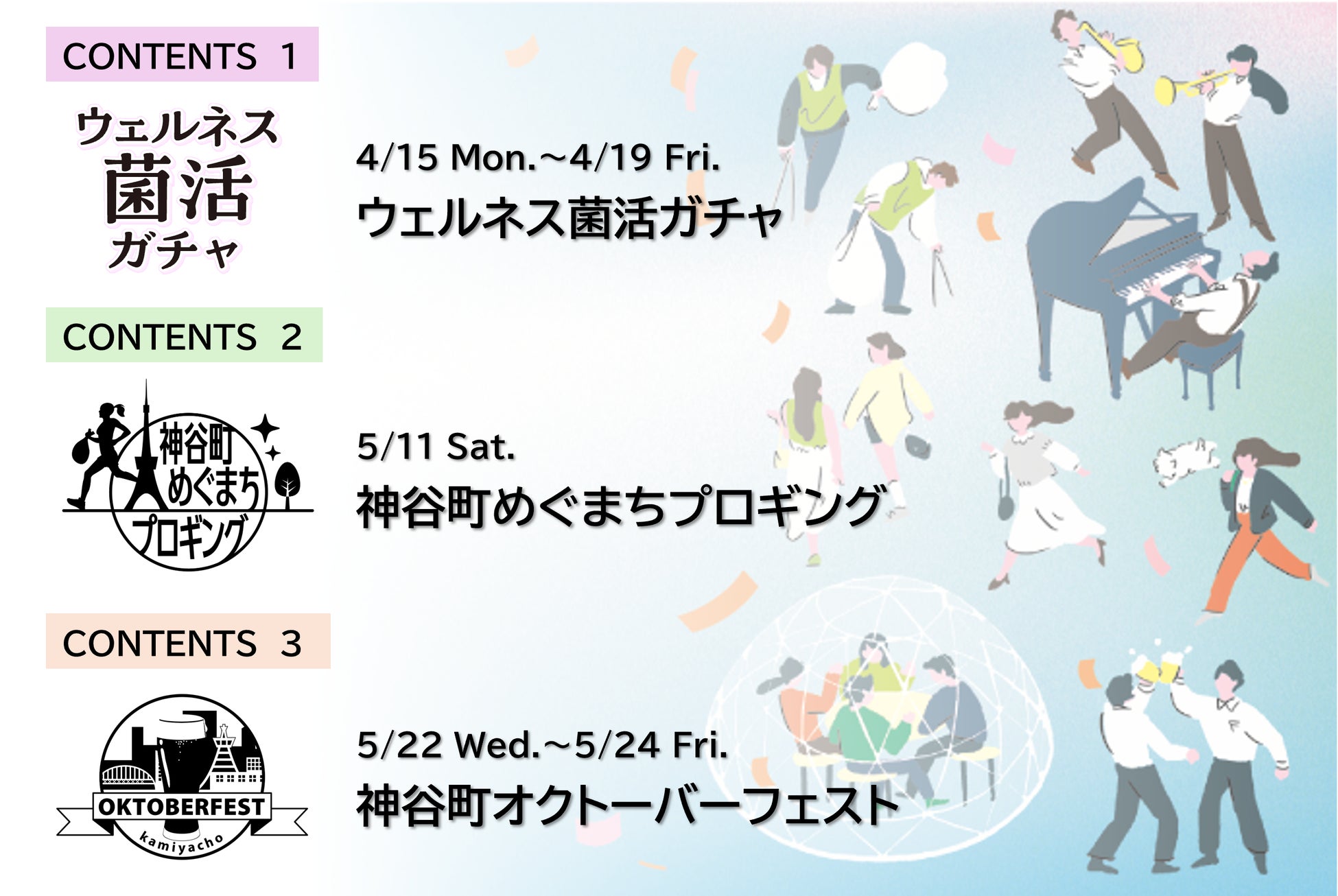 ウェルネス菌活ガチャや神谷町めぐまちプロギング、神谷町オクトーバーフェストなど、多彩なイベントが予定されています。