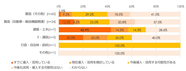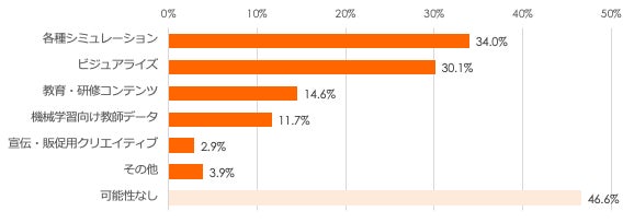 最も導入が多かった業種は「建築・土木」で42.9%で、活用分野では「シミュレーション」が34.0%、「ビジュアライズ」が30.1%でした。
